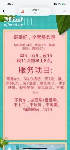 服务项目: 鸳鸯浴,漫游,胸推,69式,冰火,口活,爱爱、SM